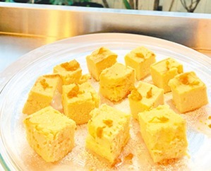 2 | 豆乳を混ぜ、みかんの皮をみじん切り(飾り用に少し取り置く)にして加える。実は搾り、果汁も混ぜて型に流し込む。 |